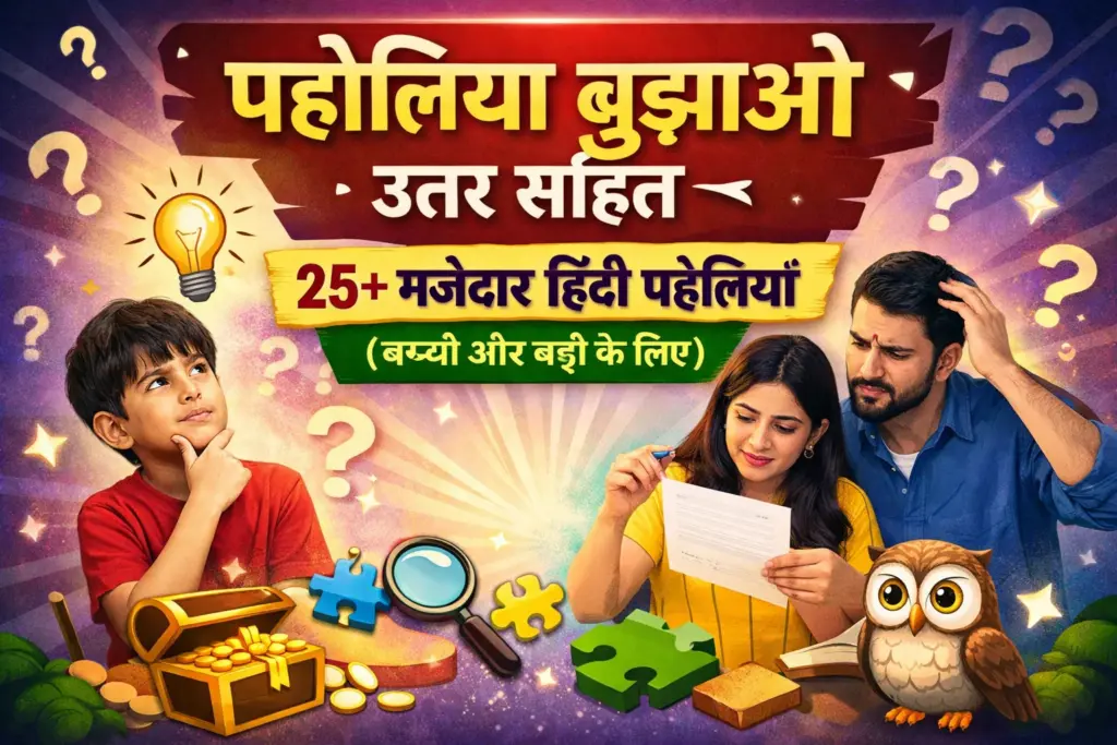 fun Hindi puzzles – पहेलियाँ सिर्फ मनोरंजन का साधन नहीं होतीं, बल्कि दिमाग को तेज करने, भाषा को रोचक बनाने और परिवार या दोस्तों के साथ हंसी-खुशी समय बिताने का शानदार तरीका भी हैं। बच्चों से लेकर बड़ों तक, हर उम्र के लोग मजेदार हिंदी पहेलियाँ सुनना और उनके उत्तर सोचकर बताना पसंद करते हैं। खास बात यह है कि पहेलियाँ हमारी सोचने की क्षमता, तर्क शक्ति और कल्पनाशीलता को एक साथ सक्रिय करती हैं। जब कोई आसान सवाल उलझे हुए अंदाज में पूछा जाता है, तो उसे समझना और सही जवाब देना अपने आप में मजेदार चुनौती बन जाता है। इस लेख में आपको 25+ मजेदार हिंदी पहेलियाँ उत्तर सहित पढ़ने को मिलेंगी, जिन्हें आप स्कूल, घर, पार्टी, पारिवारिक कार्यक्रम या सोशल मीडिया पर भी शेयर कर सकते हैं।